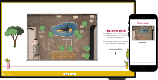 Beat the Heat is a digital learning material aimed at primary school students about extreme heat. Students learn about calculating energy use and savings, the qualities of different materials in relation to heat, plants’ ability to lower ambient temperatures, and a multitude of concrete heat adaptations that could be implemented in their environments. In a number of different “mini-games”, students collaboratively plant trees on a virtual playground, “spot the difference” between a heat-adapted and a non-heat-adapted school, guess the temperatures on different parts of a “green roof”, answer math questions in a quiz, and discuss the heat adaptations that would make the biggest difference in their own lives.